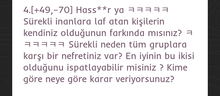 4.[+49,–70] Hass**r ya ㅋㅋㅋㅋㅋ Sürekli inanlara laf atan kişilerin kendiniz olduğunun farkında mısınız? ㅋㅋㅋㅋㅋㅋ Sürekli neden tüm gruplara karşı bir nefretiniz var? En iyinin bu ikisi olduğunu ispatlayabilir misiniz ? Kime göre neye göre karar veriyorsunuz?