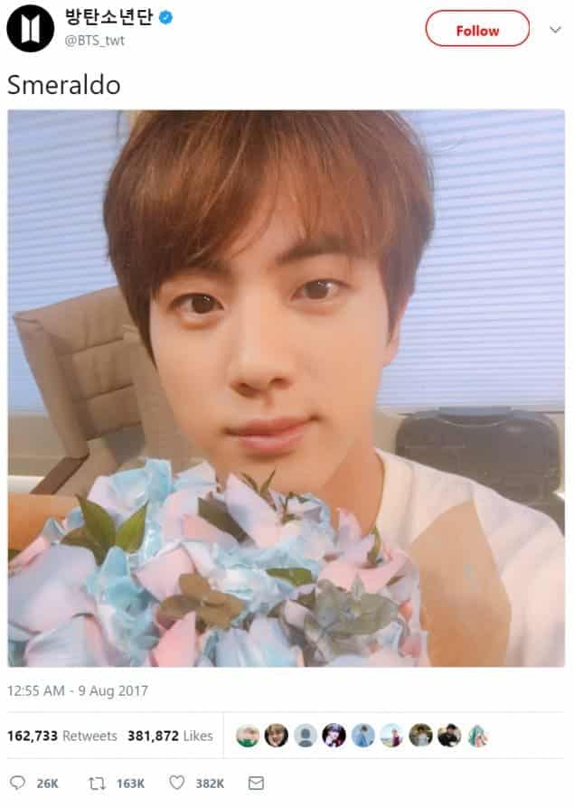 Herşey Jin’in ” “Smeraldo” başlığıyla yüklediği selfie ile başladı.Görünüşe göre yazdığı gibi “Smeraldo” çiçeklerin adı demek.