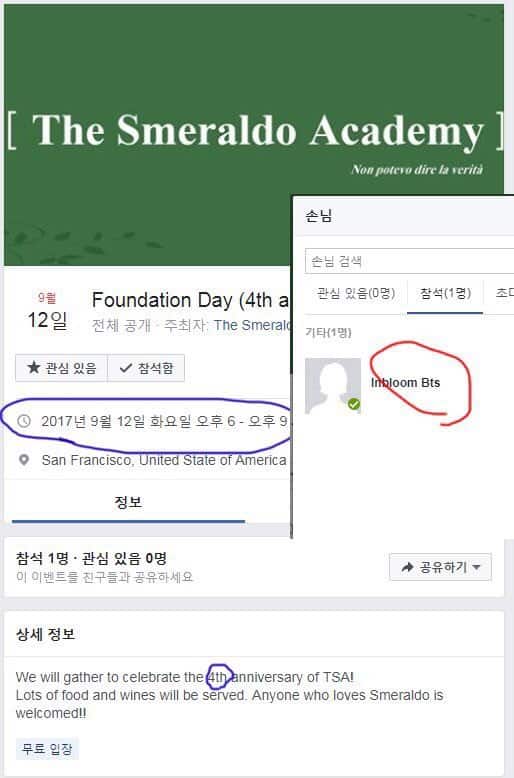 Smeraldo Akademisinin kuruluş günü Rap Monster’ın doğum günü olan 12 Eylül’e denk geliyor.Aynı zamanda Smeraldo akademisinin 4.yıldönümü ve BTS’te 4.yılında.Şu zamana kadar katılan üye “Inbloom BTS” olarak adlandırıldı.