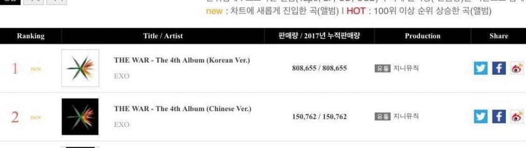EXO’nun “The War” albümünün sadece Korece versiyonu bile 808,655 kopya satarak en çok albüm satış rekorunu kırdı. Gaon grafiklerine 2 hafta üst üstte ilk sırada olan EXO bu haftada yerini korudu.