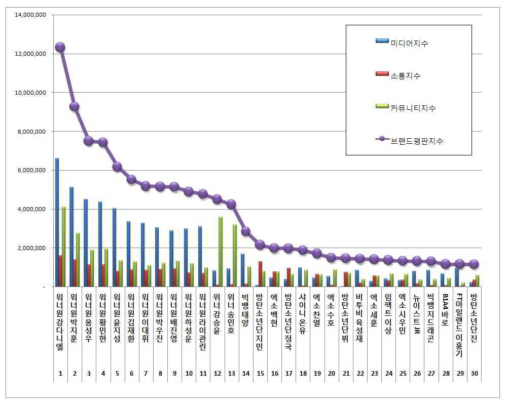 Wanna One grubunun 11 üyesinin hepsi de ilk 11’de yer alarak listeyi süpürdü.Kang Daniel,toplamda 12,312,856 marka itibar verisi ile ilk sırada yer aldı.Kang Daniel ile birlikte “Wanna One”, “Energetic” ve “Abs” (Karın kası) anahtar kelimeleri çoğunluktayken,”Sevimli”,”Yakışıklı” ve ”Havalı” kelimeleri de en çok aranan kelimelerdi.