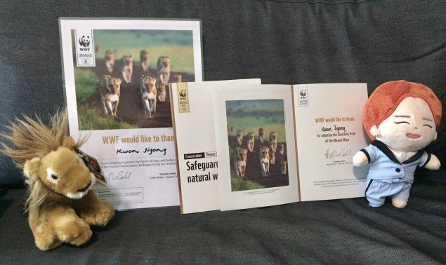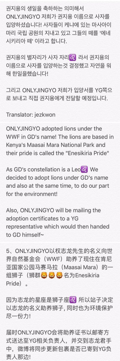 Fan sayfası bir aslan benimsemeye karar verdi çünkü G-Dragon’un burçu Aslan. ONLYJINGYO’ya göre sertifikalar, G-Dragon’a teslim edilmesi için bir YG temsilcisine teslim edilecek.