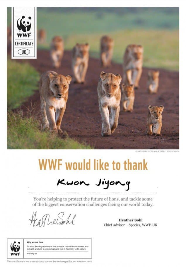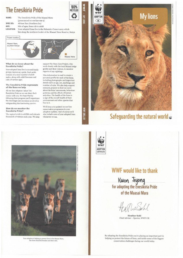 Hayranlar kendileri için bir aslana sahip olmakla kalmayıp, ancak benimsemeleri Dünya Doğal Hayatı Koruma Fonu (WWF) aracılığıyla gerçekleştirildi; hayranlar, nesli tükenmekte olan türlerin bakımı için kullanılmak üzere para bağışlayabilirler. Hayranların benimsediği aslan, Kenya’daki Masai Mara Ulusal Rezervi’nde yaşıyor ve Enesikiria Pride sürüsünün bir parçası.