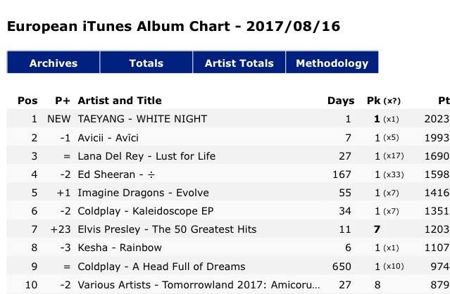 30 ülkedeki iTunes albüm listelerinde 1 numarada “White Night” yer aldı: Fransa, Meksika, Yunanistan, Hong Kong, Singapur, Tayvan, Brunei, Kamboçya, Şili, Kolombiya, Danimarka, Dominik Cumhuriyeti, Finlandiya, Endonezya, Kazakistan, Makao, Malezya, Peru, Filipinler, Tayland, Bahamalar, Türkiye ve Vietnam.