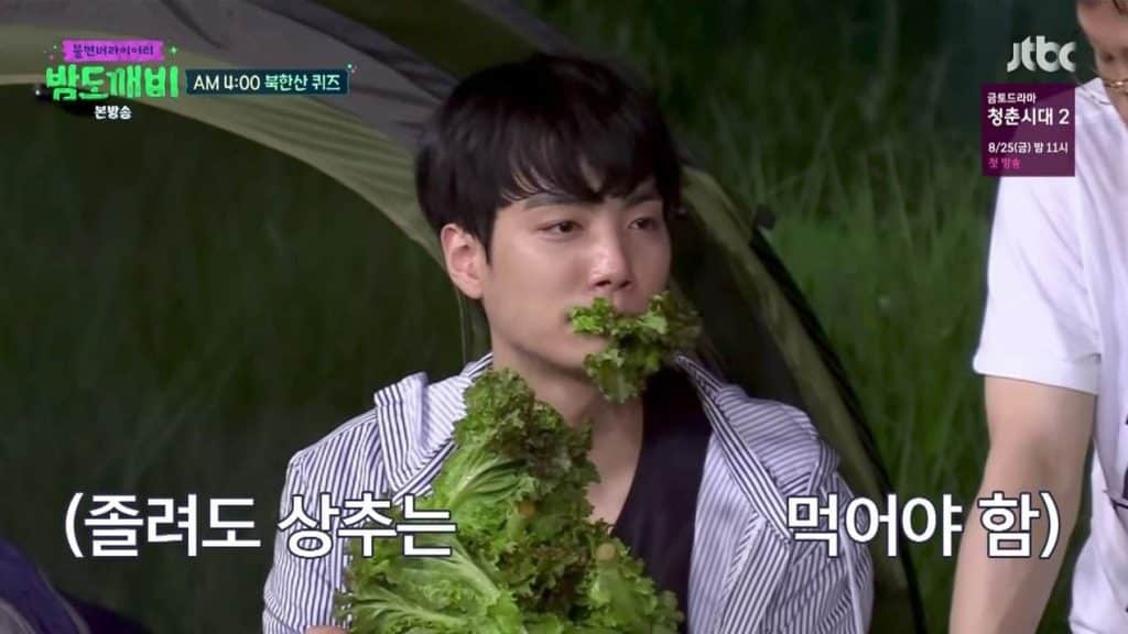 JR’ın “eksik goblin” imajı Girl’s Day’den Yura konuk olarak katıldığında da devam etti. Grup bir oyun oynamaya karar verdi ve bir üyenin sorusu olduğu her seferinde diğerleri marul yemek zorunda kalacaktı. Soruları çok zor bulan ve çok fazla marul yemek zorunda kalan JR’a Lee Soo Geun dişlerinde yeşil lekeler olduğunu belirtti.