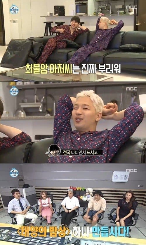 Seungri’nin duştan çıkmasını beklerken, Daesung ve Taeyang kanepede oturdu ve aktör Choi Bool Am’in ev sahipliği yaptığı bir TV şovu olan “Korean Cuisine and Dining” i izlediler. Taeyang, bu programın büyük bir fanı olduğunu ve geçen hafta “I Live Alone” bölümünde Kore yemeklerine olan sevgisinden bahsetti.