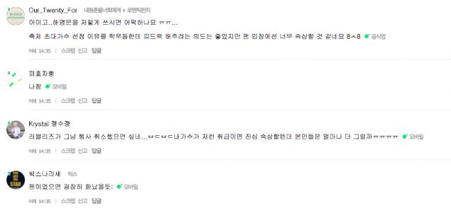 Bazı yorumlar şu şekildeydi:”Lovelyz ile ne sorunuz var?”,”Vay,bu da ne…gerçekten çok kaba.”,”Lovelyz grubuna karşı çok düşüncesizce bir davranış.”,”Ah…ilk satırdan itibaren, böyle söylemeleri bence kaba bir hareket.”,”İnsanlara ne hakla fiyat etiketi koyabilirsiniz ki?”,”Umarım ki,tüm etkinlik iptal edilir.” ve daha fazla yorum.