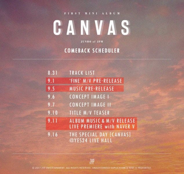 31 Ağustos’tan başlayarak, Junho yeni albümüne yönelik çeşitli teaser görüntüleri ve videolar yayınlayacak. ‘Canvas’ 11 Eylül’de yayınlanacak ve 16’sında Yes24 Canlı Yayınında performans sergileyecek.