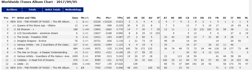 EXO, 4. repackage albümleri The War: The Power of Music ile iTunes’in Dünya çapındaki albüm listesine ilk sıradan giriş yaptı.