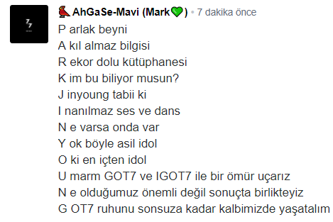 (?AhGaSe-Mavi (Mark?) , ♡ єℓιƒ ηυя ♡, °•○●AHGASE●○• , En jacky benim, esilala, AhGaSe-KeRiM, ozlem , tarçınlı Rulo,cebom,Crazyahgase,nur,GOT7,MissKzk? Ahgase?, refdref)