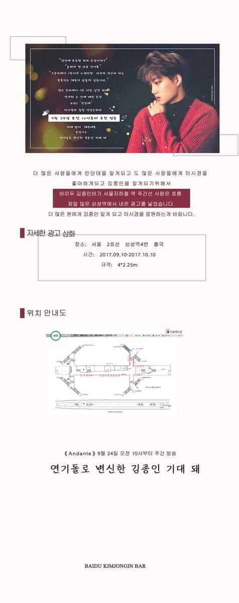 4. Kim Jongin Bar, Seul Metro Hattının Samseong İstasyonunda bulunan billboard da Andante’nin destek afişi 10 Ekim’e kadar kalacak şekilde bir proje gerçekleştirdi.