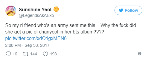Bir fan BTS’in son albümü Love Yourself: Her’ün içinde Exo üyesi Chanyeol’un foto kartını buldu.