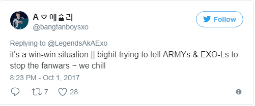 Diğerleri Chanyeol’un ajan olması veya, ajansların fan savaşlarını sona erdirme girişimi olduğu hakkında dalga geçtiler.