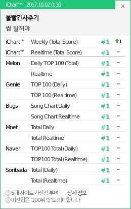 2 Ekim tarihinde Kore saati ile 12:30’da “Some” bir kez daha eş zamanlı olarak listelerde zirveye oturdu. Yani Kore’nin en önemli 6 müzik sitesinin tümünde gerçek zamanlı ve günlük listelerde ve iChart’ın gerçek zamanlı listesinde 1 numara oldu!