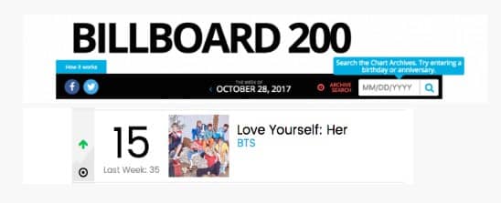 ‘Billboard 200’ listesine göre, popüler idol grubu 28 Ekim haftasında ‘Love Yourself: Her’ albümleriyle 15. sırada yer alıyor, geçen hafta 35. sıradaydı.