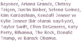 US Weekly’nin listesinde 15 ünlü bulunuyor, ve bu ünlüler Twitter ve Instagram üzerindeki en fazla etkiye sahip kişiler arasından seçiliyor. Listede yer alan diğer ünlü kişiler Beyonce, Ariana Grande, Chrissy Teigen, Justin Bieber, Selena Gomez, Kim Kardashian, Kendall Jenner ve Kylie Jenner (bir olarak sayılıyor), Taylor Swift, Ellen DeGeneres, Katy Perry, Rihanna, The Rock, Donald Trump, ve Barack Obama.