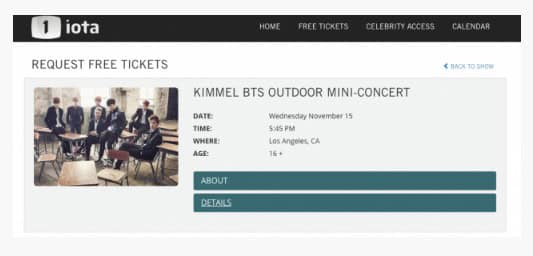 Görünüşe göre, BTS grubu, ‘Jimmy Kimmel Live’ konser serisinin bir parçası olarak, mini bir açık hava konseri verecek. Bilet satış sitesine göre ‘Jimmy Kimmel Live’ performansları 15 Kasım’da saat 17:45’de Los Angeles da gerçekleşecek.