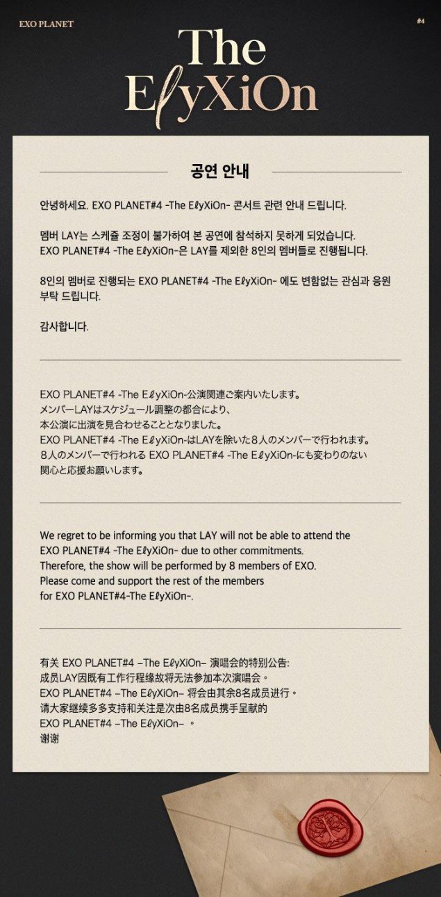 14 Kasım‘da şirket tarafından; “LAY diğer programları nedeniyle EXO PLANET#4 -The EℓyXion- konser turuna katılamayacaktır. Bu nedenle Özür Diliyoruz. Fakat konser turunda yer alacak olan 8 EXO üyesi performans sergileyecek. Lütfen EXO PLANET #4 -The EℓyXiOn- turu boyunca onlara destek olmaya devam edin.” açıklaması yapıldı.