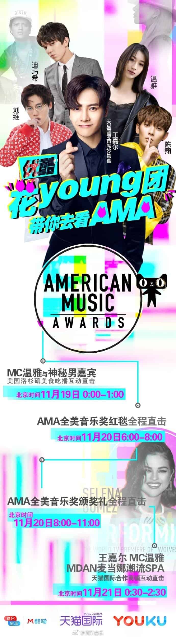 17 Kasım’da, Çin stream websitesi Youku, Jackson’ın birkaç Çinli yıldızla birlikte AMAs’a izleyici olarak katılacağını duyurdu.
