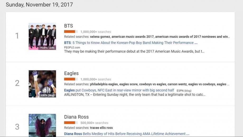 Ödül törenindeki fan ve izleyicilerden aldıkları sevgi de değil sadece, aynı zamanda performansları sayesinde çokça ilgi çektiler. BTS AMAs yayınının ardından, Amerika’daki Google arama trendlerinde 1 milyonun üzerinde aramayla ilk sırada yer aldı. Diğer alakalı aramalar arasında Selena Gomez ve American Music Awards 2017 yer alıyordu.