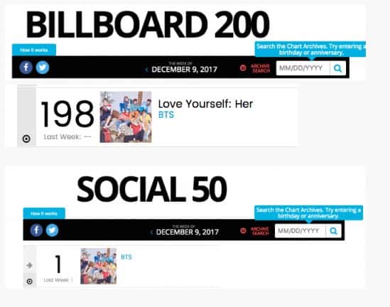 28 Kasım’dan itibaren, BTS’in “Love Yourself: Her” albümleri Billboard ‘200’ listesinde 198. sırada ve grup ‘Social 50’ listesinde 1. sırada yer alacak. Üyeler, ABD’de pek çok talk şov ve radyo programına katılmışlar ve küresel tanınma yolunda daha da ilerlemişlerdi.