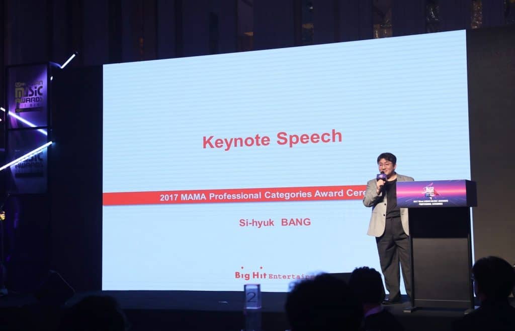 2016 MAMA’da En İyi Yapımcı Ödülünü alan BigHit Entertainment kurucusu Bang Shi Hyuk, törende özel bir konuşma yaptı. Konuşmanın konusu “beraberlik” idi ve BTS’in başarısı ve Batı müziği pazarından bahsetti. “K-pop’un gelişimine yönelik çalışan bütün sanatçı ve yapımcıların çalışmaları BTS‘in atılımında belirleyici bir rol oynamıştır. K-pop’un önceki başarıları olmasaydı, BTS bu kadar başarılı olamazdı. Bu fırsatı kullanarak teşekkürlerimi sunmak isterim.” dedi.