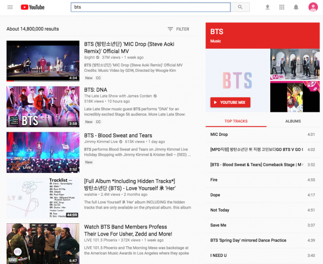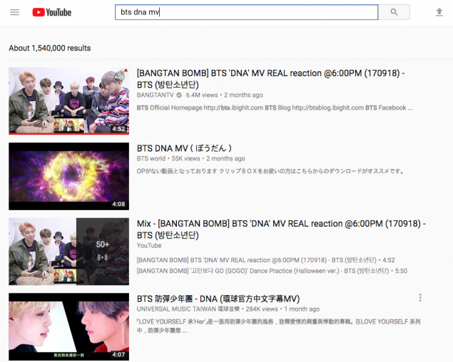 Genellikle, K-pop grubunun ismi YouTube’da arandığında resmi kanaldaki en iyi şarkıları ilk listelenen videolardan biri olur. Ancak, BTS’in aramalarında resmi “DNA” videosu görünmüyor.