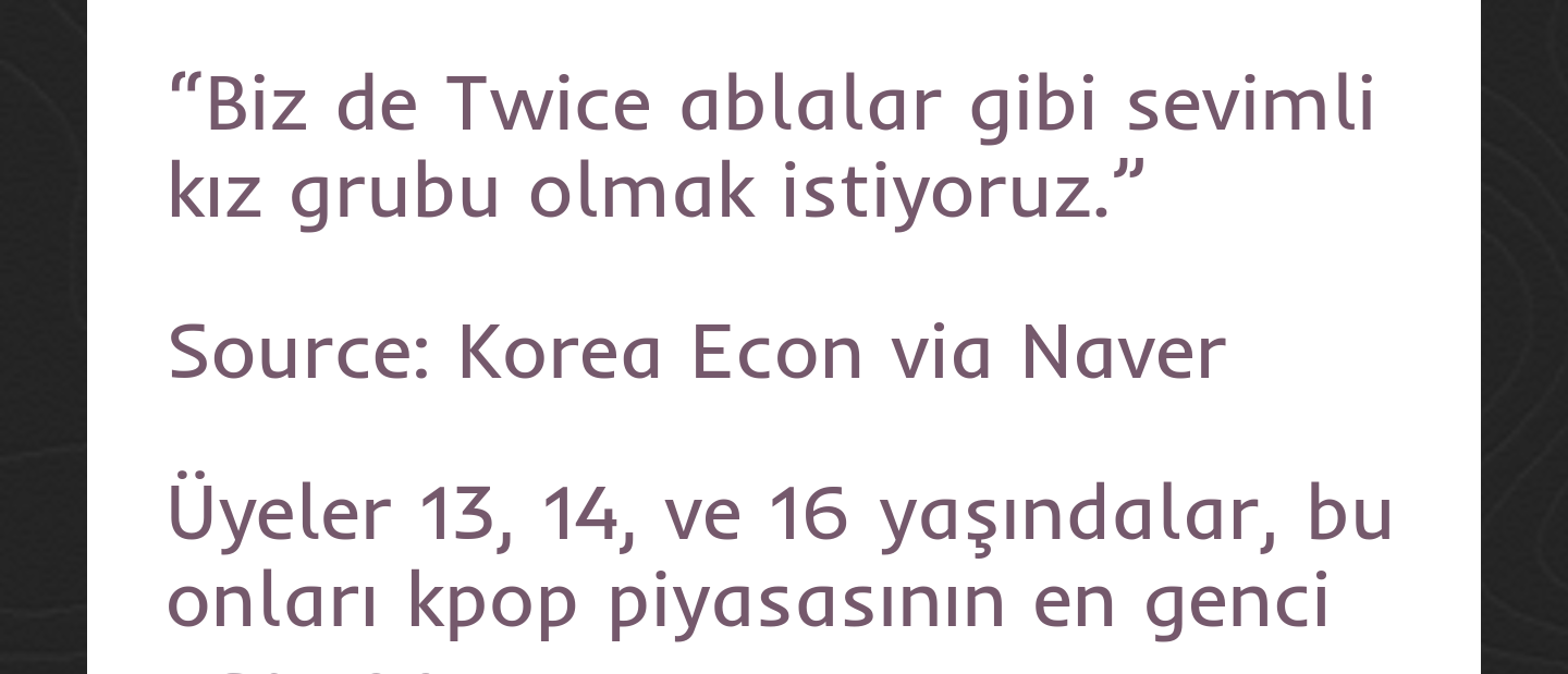 Üyeler 13, 14, ve 16 yaşındalar, bu onları kpop piyasasının en genci yapıyor.