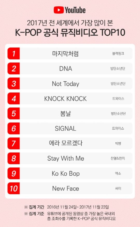 BLACKPINK‘in “As If It’s Your Last” K-pop videosu Kore dışında en çok izlenen video olarak ilk sırada yer aldı. Onun ardından BTS, “DNA” ile 2., “Not Today” ile 3. ve “Spring Day” ile 5. oldu.