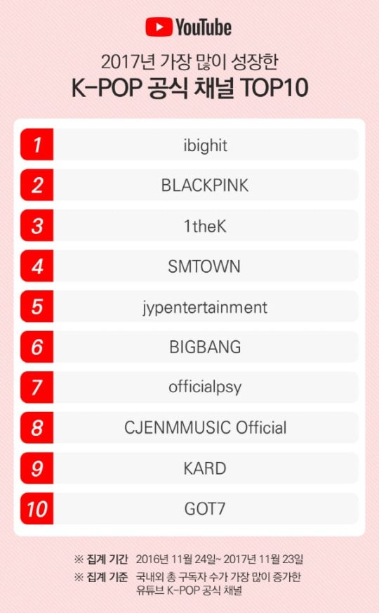 SM Entertainment’ın kanalı 4. ve JYP Entertainment’ın kanalı 5. sıradalar. 1theK ve CJ E&M müzik kanalları da sırasıyla 3 ve 8. sıraya bulunuyorlar.