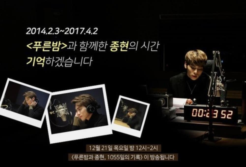 20 Aralık’ta MBC radyo, “21 Aralık Perşembe gecesi 24:00-02:00 saatleri arasında ‘Blue Night and Jonghyun, 1055 Day’s Record‘ yayınını yapacak. Jonghyun’un ‘Blue Night’ zamanını hatırlayalım. Jonghyun, 3 Şubat 2014’den geçen Nisan ayına kadar DJlik yaparak dinleyicilerini ağırlamıştı. Radyo programı yapmayı ve misafirlerini ağırlamayı sevdiğini söylüyordu ve yoğun programına rağmen, Jonghyun 3 yıl boyunca takım elbisesini giyerek ‘Blue Night’ programında ev sahipliği yaptı.” açıklamasını yaptı.