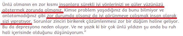 Ünlü olmanın en zor kısmı insanlara sürekli iyi yönlerinizi ve güler yüzünüzü göstermek zorunda olmanız. Kimse problem yaşadığınız da bunu bilmiyor ve anlatamadığınız gibi zor durumda olsanız da iyi görünmeye çalışmak insan olarak sizi yıpratıyor. Sorunlar zinciri birikerek çözümlenmesi zor bir düğüm haline geliyor. Bu da depresyona neden oluyor. Ve ne yazık ki bir çok ünlü yıldızın şu anda bu ruh hali içerisinde olduğunu düşünüyorum.”