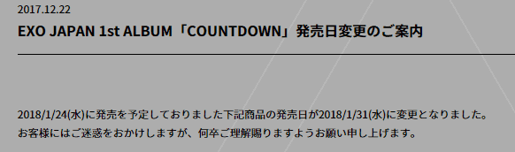 EXO’nun Japonya’da yayımlayacağı ilk full albümleri “COUNTDOWN”ın çıkış tarihi ertelendi.