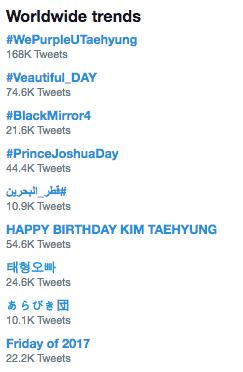 #WePurpleUTaehyung, #Veautiful_DAY, #KimTaeHyung, #태형 오빠 ve #HAPPYBIRTHDAYKIMTAEHYUNG dahil olmak üzere fanlar dünya çapında trend oluşturuyor ve idol yıldızın çok özel doğum gününü kutluyor.