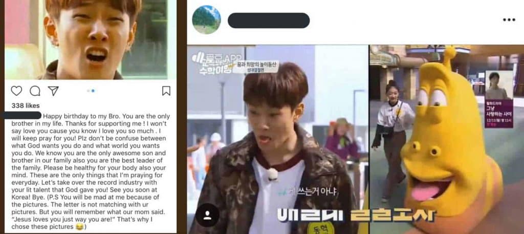 “Doğum günün kutlu olsun Bro. Sen hayatımdaki tek kardeşsin. Beni desteklediğin için teşekkürler! Seni sevdiğimi söylemeyeceğim çünkü seni ne kadar sevdiğimi biliyorsun. Senin için dua etmeyi sürdüreceğim! Lütfen Tanrı’nın ve dünyanın senden ne yapmanı istedi arasında telaşlanma. Biz biliyoruzki sen ailemizin müthiş oğlu ve kardeşisin, ayrıca ailenin en iyi liderisin. Lütfen vücudun ve zihnin için sağlıklı ol. Bunlar benim hergün dua ettiğim tek şeyler. Hadi doğuştan sahip olduğun efsanevi yeteneğinle müzik endüstrisini sallayalım. Yakında Kore’de gürüşürüz! Bye. ( Not: Koyduğum fotoğraflar yüzünden bana kızacaksın. Ama annemin ne dediğini hatırlayacaksın. “Jesus( Hz. İsa) seni olduğun gibi seviyor!” Bu yüzden bu fotoğrafları seçtim 😀 ”