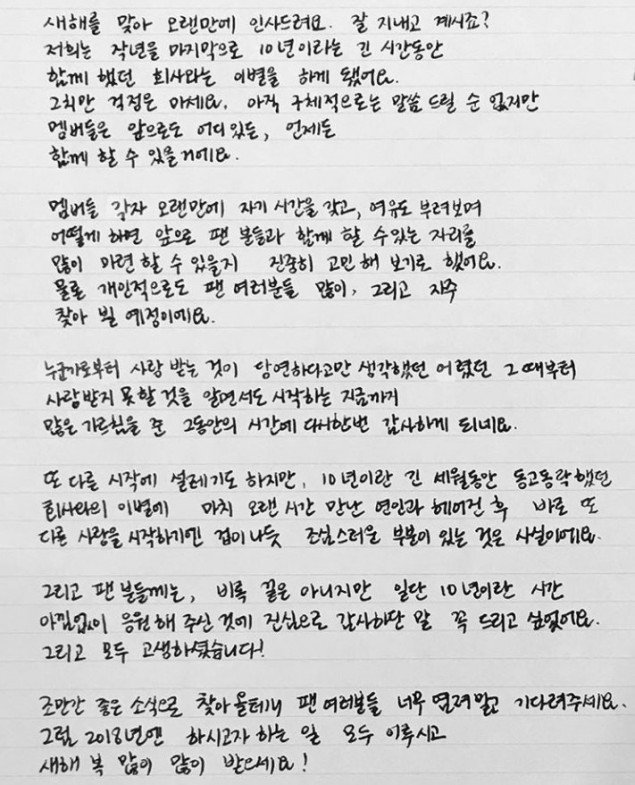 Bir süre önce üyeler kendileri için zaman ayırarak düşünme fırsatı buldular. Gelecekte hayranlarımızla buluşmak için nasıl bir alan oluşturabileceğimiz konusunda içtenlikle düşünmeye karar verdik. Tabii ki, hayranlarımızla gelecekte bol bol buluşmayı planlıyoruz. Gençliğimden bu zamana kadar beri bana çok şey öğreten anlara minnettarım. Bu nedenle onların sevgisini gördüğüm için bir kez daha onlarla birlikte olmaya karar verdim. Yeni bir başlangıç düşüncesi beni heyecanlandırıyor ancak 10 yıllık şirketinden ayrıldığım için çok daha dikkatli olmam gereken konular var. Sevgilimle ayrılmışım gibi geliyor ve bu ayrılıktan hemen sonra yeni bir aşkı başlatmaktan korkuyorum.