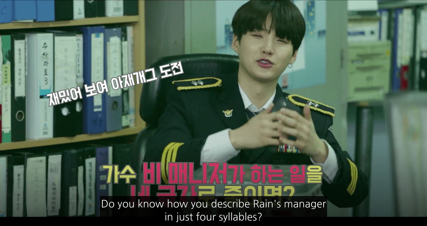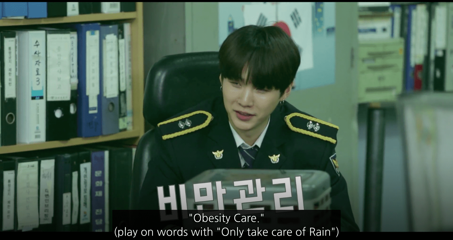 (0:37 civarlarında) Bu şaka “gong (jing)” kelimesi üzerine yapılmış. İngilizce bir kelime olan “amazing” (inanılmaz) Korece “amaJING” olarak teleffuz edilebiliyor.