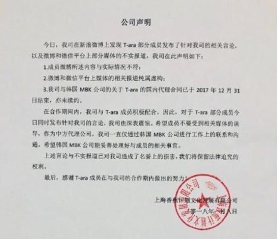 3. T-ara, Çin’deki yönetim şirketi ve MBK Entertainment ile olan sözleşmesini 31 Aralık 2017’den sonra yenilemedi.