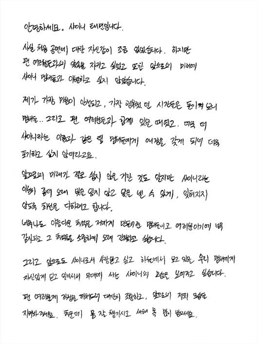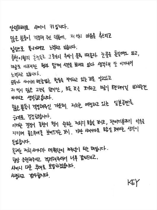 Mücadelemizin boyutu, başkalarının tahmin edebileceğinden çok daha fazlası, ama bunu aşmak için bize güç vereceğinize inanıyoruz. SHINee olarak desteklediğiniz her gün için minnettarız ve kalbimizi siz ve Jonghyun için adayacağız. Samimi desteğinizle bu soğuk kış günlerinin geçirmemize yardımcı olacağını düşünüyorum. Teşekkür ederim.