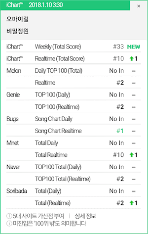 10 Ocak Kore saatiyle 03.30 olduğunda şarkı ayrıca Melon (Korea’nin en büyük müzik sitesi), Genie, Naver ve Soribada‘nın gerçek zamanlı listelerinde 2. sırada yer aldı. Vokal grubu Jang Deok Cheol’nun “Good Old Days” şarkısı bu müzik sitelerinin listelerinde 1. sıradaki yerini sürdürüyor.