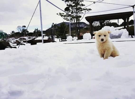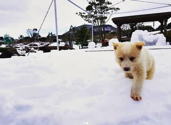 Karların içinde duran beyaz, tüylü köpek; köpekten çok yavru kutup ayısını andırıyor ve ikinci fotoğrafında, Kyu Jong’a yürürken görülüyor.