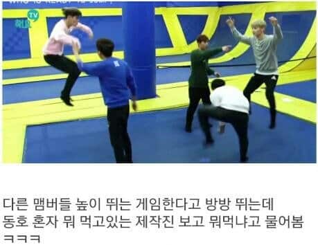 Kimin daha yükseğe atlayabileceğini görmek için bir oyun oynuyorlardı fakat çalışanlara bakan tek kişi Dongho’ydu. Yemek yiyiyorlardı ve onlara ne yediklerini sorduㅋㅋ