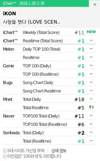 “Love Scenario” Kore’nin 5 büyük müzik listesinin gerçek zamanlı listesinde 1.sıraya yerleşti. (Melon, Genie, Bugs, Olleh, Soribada).