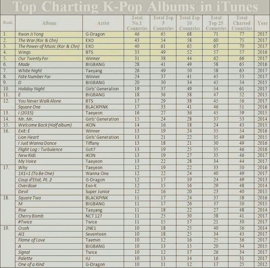 Çıktıkları tarihlerde Amerika ‘da en çok satan Kpop şarkıları sıralamasında: