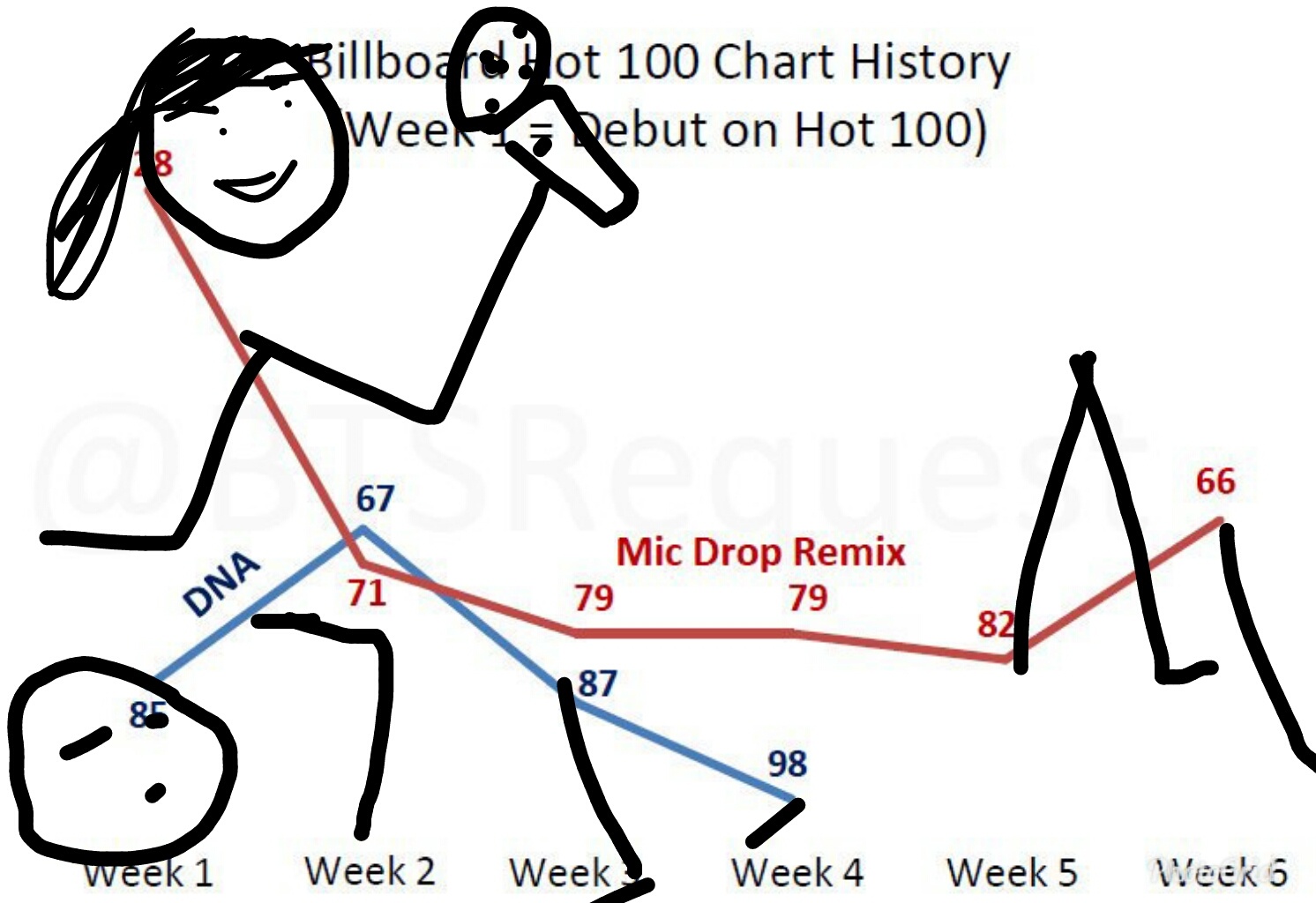 Bu hafta 98. sırada yer alan MIC Drop (Steve Aoki Remix) kıl payı da olsa listede 10. haftasına girmeyi başardı. MIC Drop, BTS’i listede en uzun süre kalan K-Pop grubu yapmıştı ve bu rekor süreyi uzatmaya da devam ediyor.