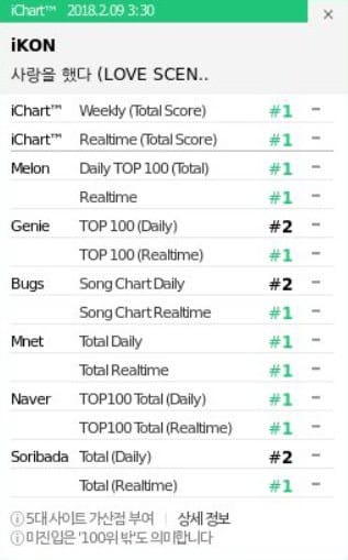 iKON ‘Love Scenario’ ile adeta listelerde yerini kimseye kaptırmıyor. Şarkı geçtiğimiz günlerde 2.haftasını tamamlarken 25 All-Kill ve 28 Perfect All-Kill (PAK) (tüm müzik listelerinin gerçek zamanlı, günlük ve haftalık grafiklerinde 1. olma) yaparak zirveye ismini yazdırıp 2018 yılının ilk perfect all-kill’ini başarmıştı.