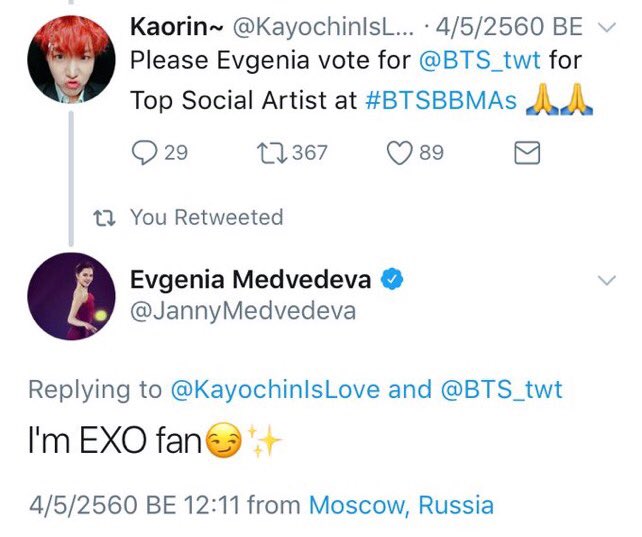 Evgenia Medvedeva, EXO‘nun onun için ilham kaynağı olduğunu ve onlar sayesinde kendinden emin hissettiğini söyleyerek EXO‘nun hayatındaki yerinden bahsetti.