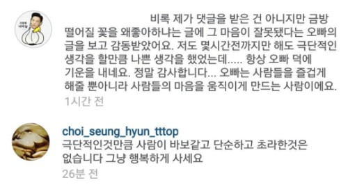 T.O.P hayranlarını dinlediğini ve onları farkettiğini bilmeleri için sosyal medya aracılığıyla onlarla iletişime geçen nazik bir ruha sahip. T.O.P üzgün düşünceleri olan bir hayrana cevap verdi ve sohbet etti.