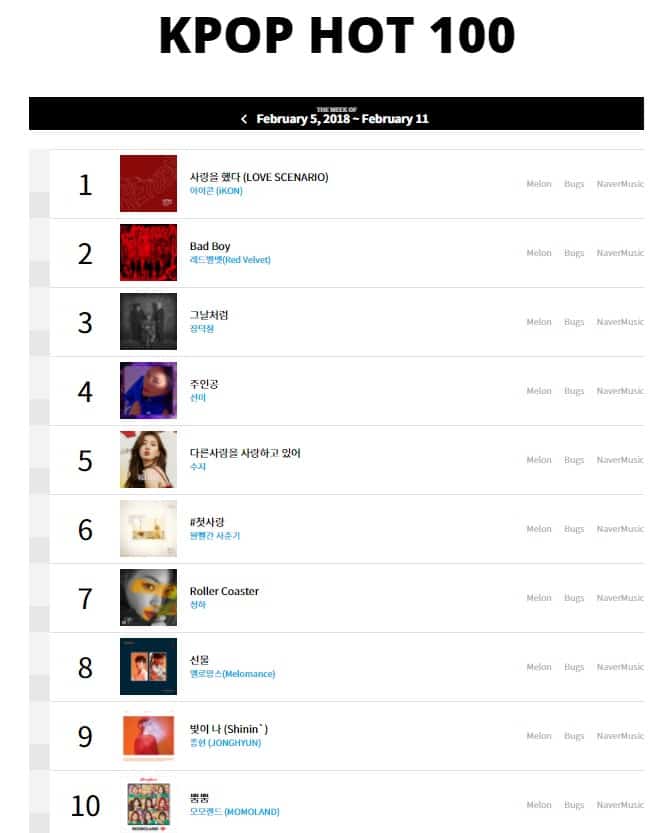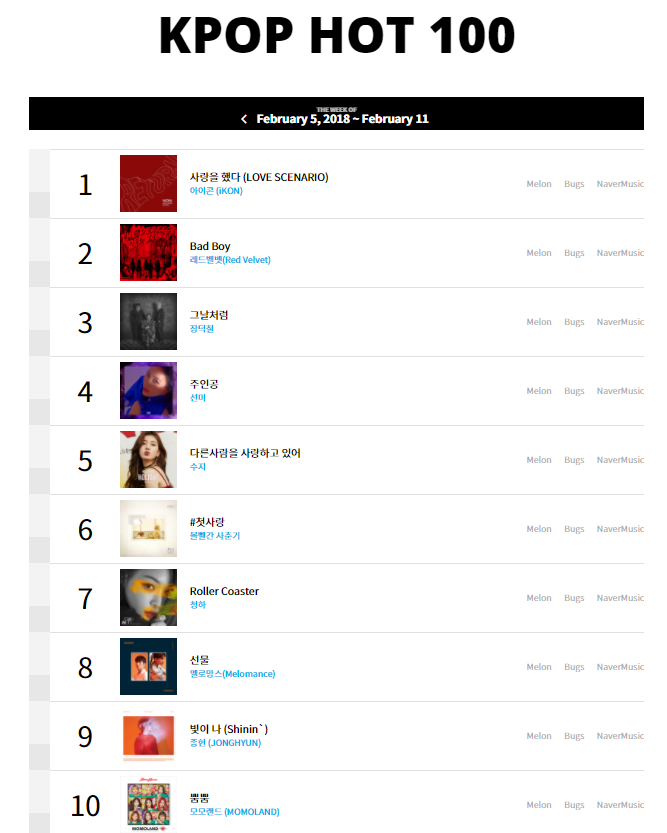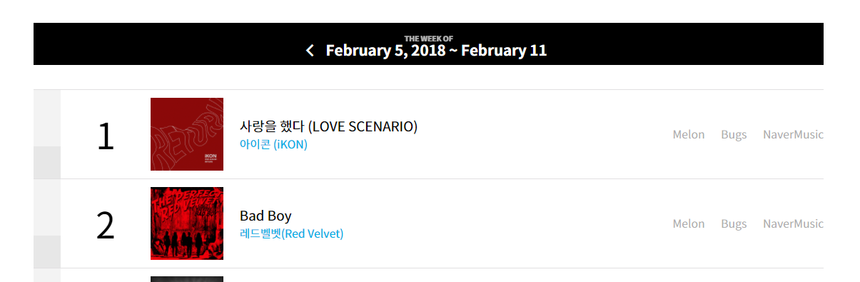 iKON ‘Love Scenario’ ile birçok sıra atlayıp bu haftanın en üstüne yükselerek listede 1.sıraya yerleşti. Ayrıca şarkı Korece olmasına rağmen Japonya‘nın Billboard TOP 100 listesine de girdi. Grubun ‘Return’ albümünden 6 şarkı daha K-Pop TOP100 listesinde bulunuyor: ‘Long Time No See’, ‘Beautiful’, ‘Jerk’, ‘Hug Me’, ‘Best Friend’ ve ‘Don’t Forget’.