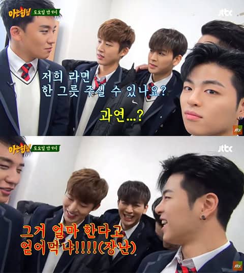 Daha sonrasında, üyeler Seungri’yi bekleme odasında ziyaret etti ve Bobby bir önceki konuşmalarını takiben Seungri‘ye sordu; “Senin bir ramen restoranı işlettiğini biliyorum. Bize ücretsiz ramen verebilir misin?” Hızlı ince esprisiyle Seungri hemen cevapladı, “Yemek için ödemelisiniz. Size daha kaç defa söyleyeceğim yemek için para ödemelisiniz diye.”